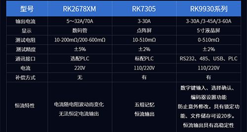 可選儀器:RK2678XM系列(電流30/32/70安培可選),程控機(jī)RK7305系列,RK9930系列(電流30/40/60安培可選),程控系列具備PLC信號輸出,RS232,RS485通訊功能。