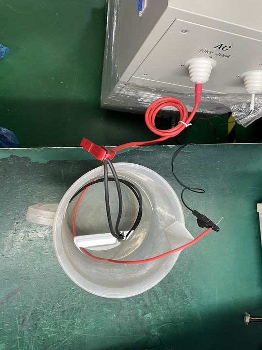 首先是對被測物處理:拿住線材兩端剝?nèi)?厘米左右長度絕緣層,將兩個(gè)線芯擰在一起并接到高壓輸出端上。拿個(gè)塑料盆子裝盆清水,把線材放入水中(線芯不要沾到水),把儀器回路端放到清水中。接線完成打開儀器開關(guān),慢慢調(diào)節(jié)電壓,觀察電流上升情況。如線材絕緣性能不好,電流會不斷上升,最終觸發(fā)報(bào)警產(chǎn)品不合格。