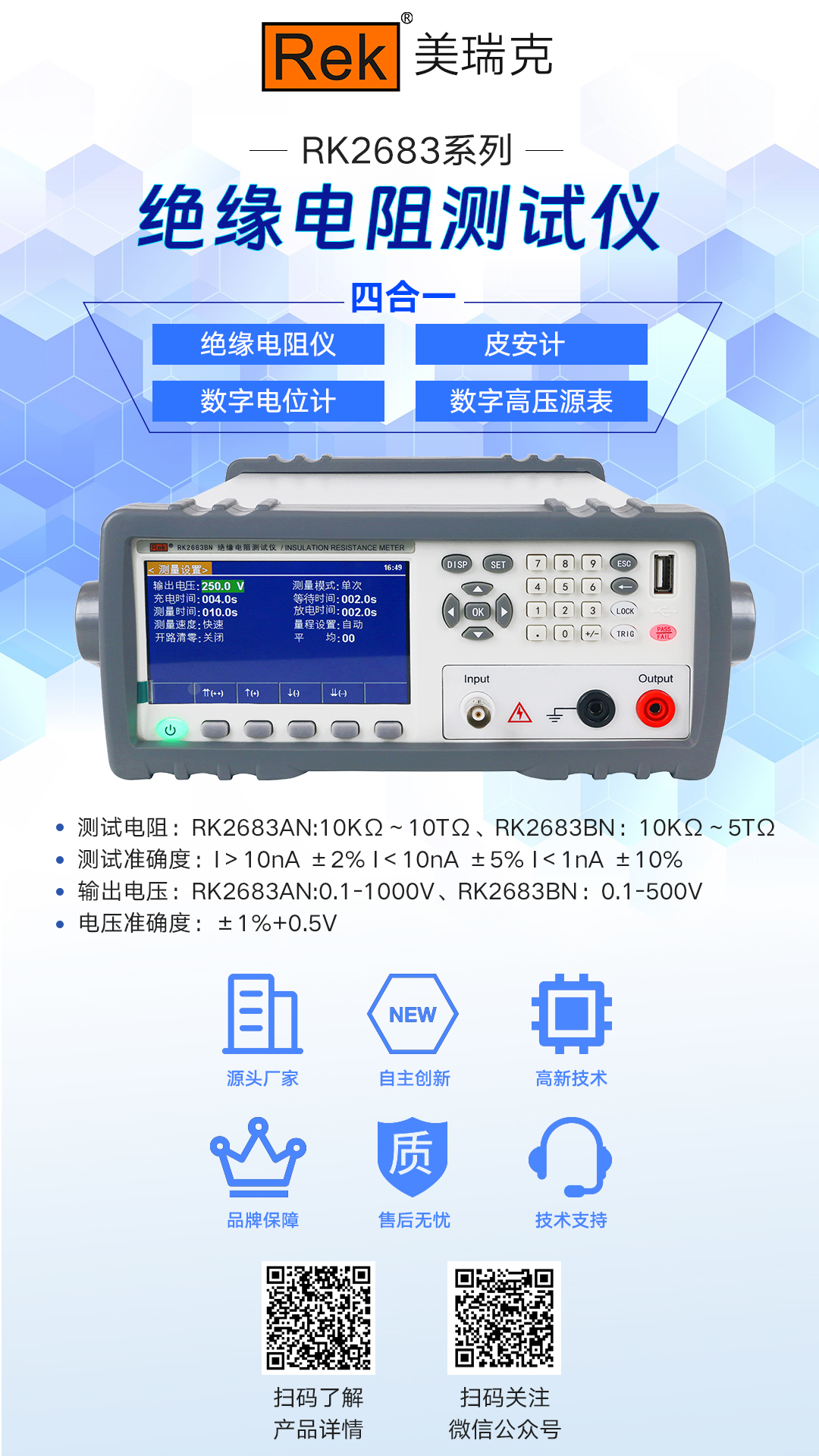 RK2683系列:該系列絕緣電阻測試儀測試電壓(1V-1000V)符臺GB4706.1.其這得電阻測式范圍最大可達(dá)到(10K-10T).RK2683系列可滿足大部分家用電器的絕絡(luò)電緣測試要求
