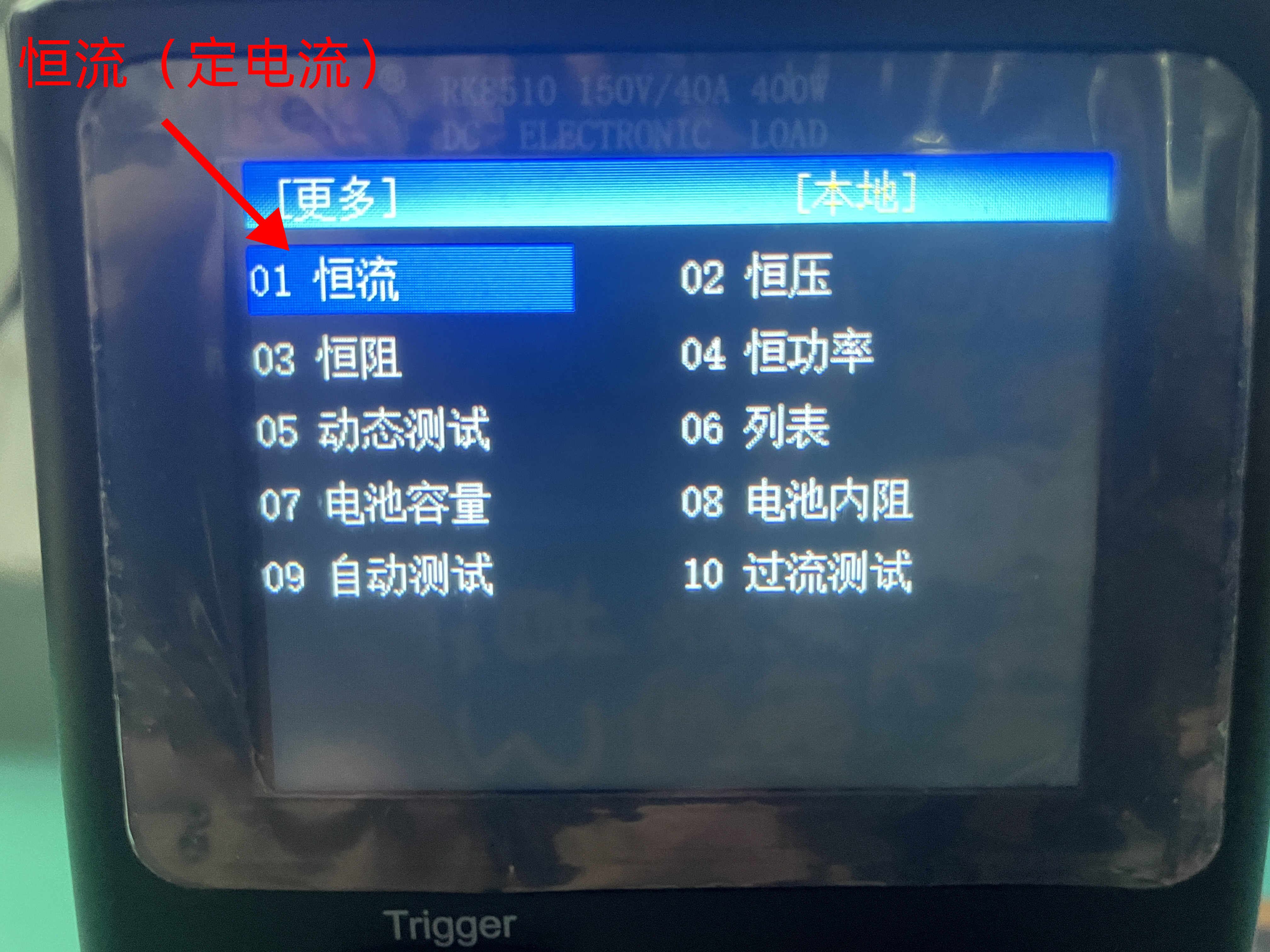 接線完成打開儀器,點(diǎn)擊Mode按鍵,進(jìn)入產(chǎn)品的模式選擇界面,RK8510擁有定電流、定電壓、定電阻模式,通過方向按鍵選擇對應(yīng)模式,首先我們選擇定電流模式點(diǎn)擊OK按鍵進(jìn)入定電流界面,點(diǎn)擊OK按鍵在設(shè)置欄調(diào)整電流值,調(diào)整好電流后按ON進(jìn)行測試。按相同方法可以測試定電壓、定功率功能。